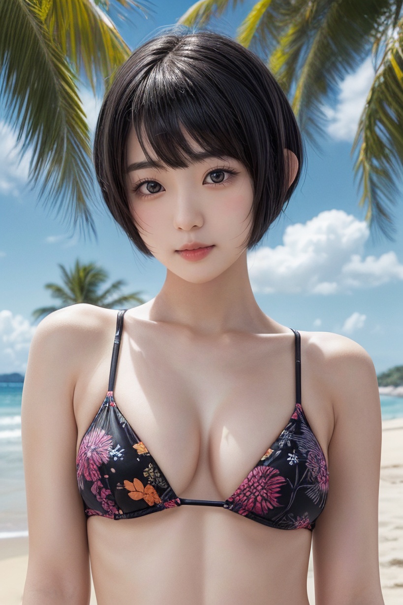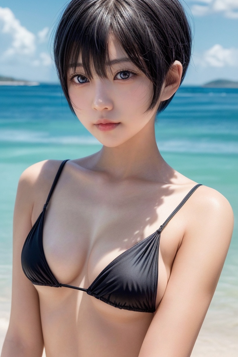 可愛い黒髪ショートヘア女子の上半身ビキニ画像