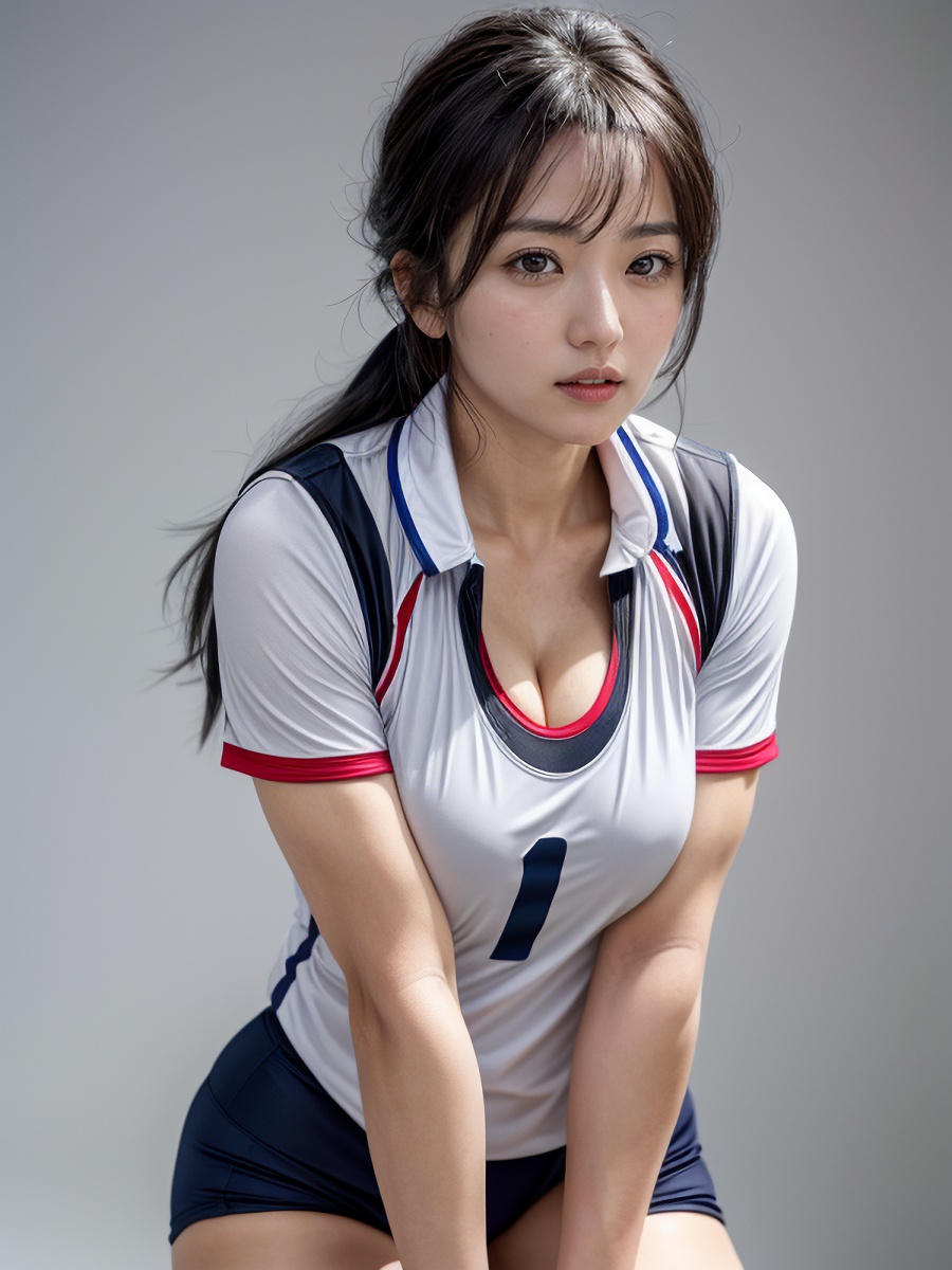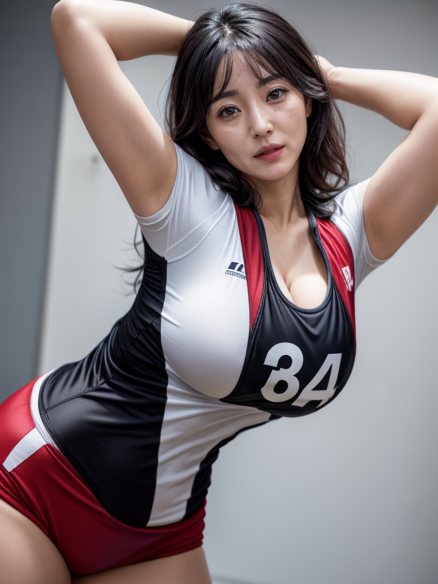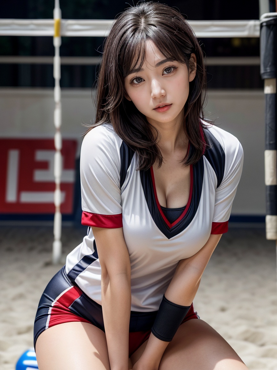 ママさんバレー黒髪熟女のバレーウェア胸の谷間AIエロ画像