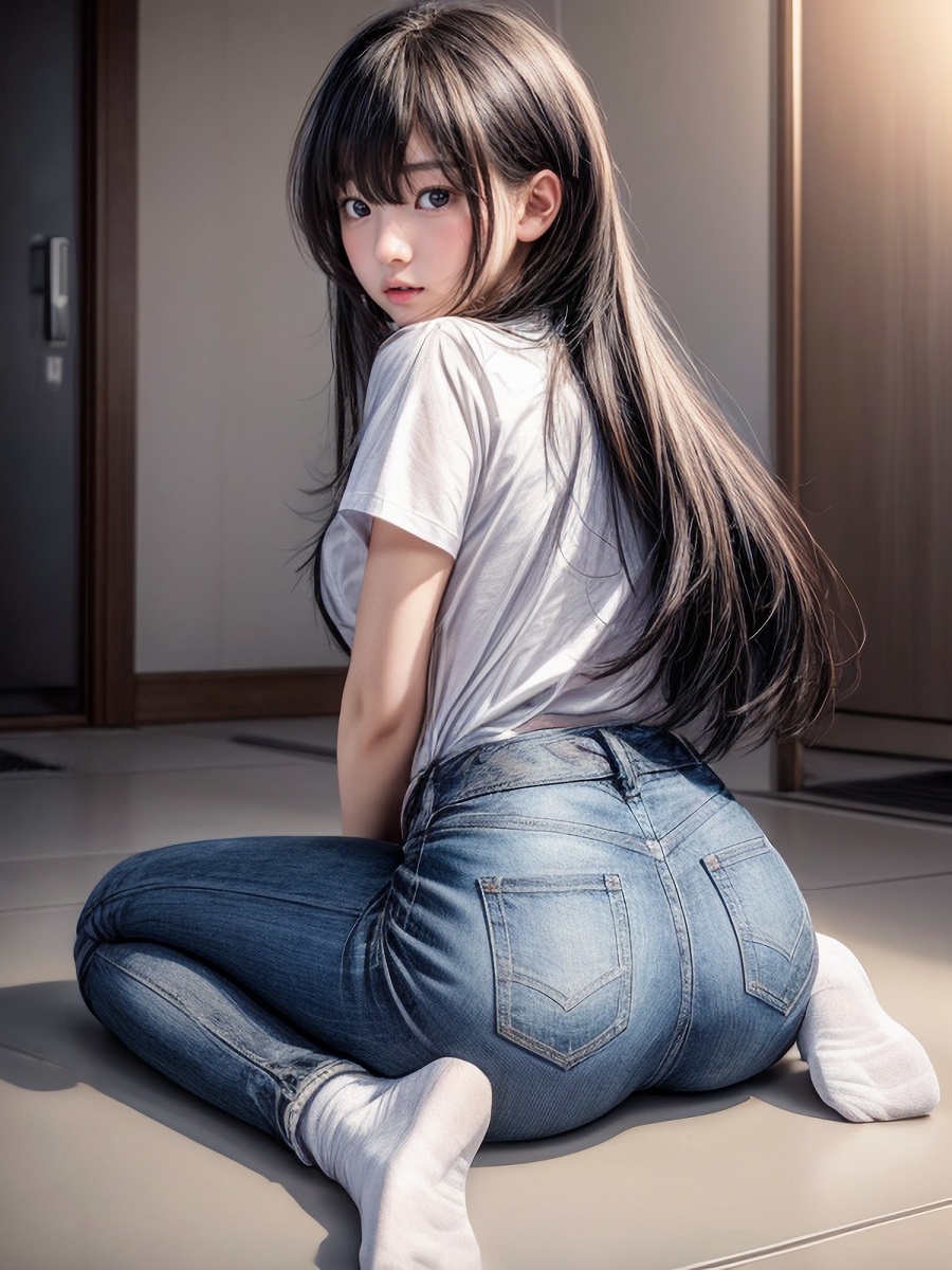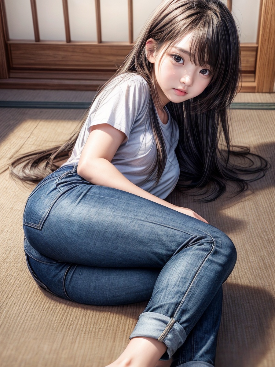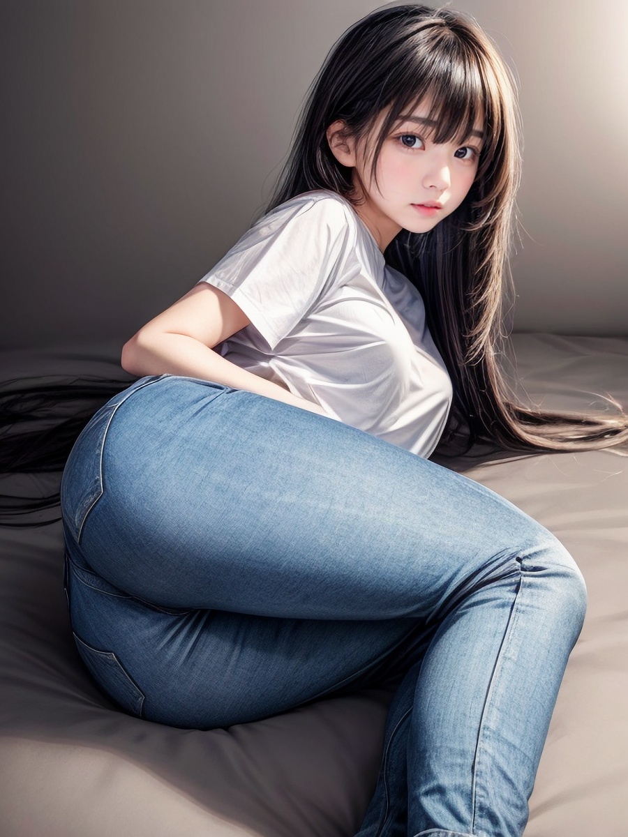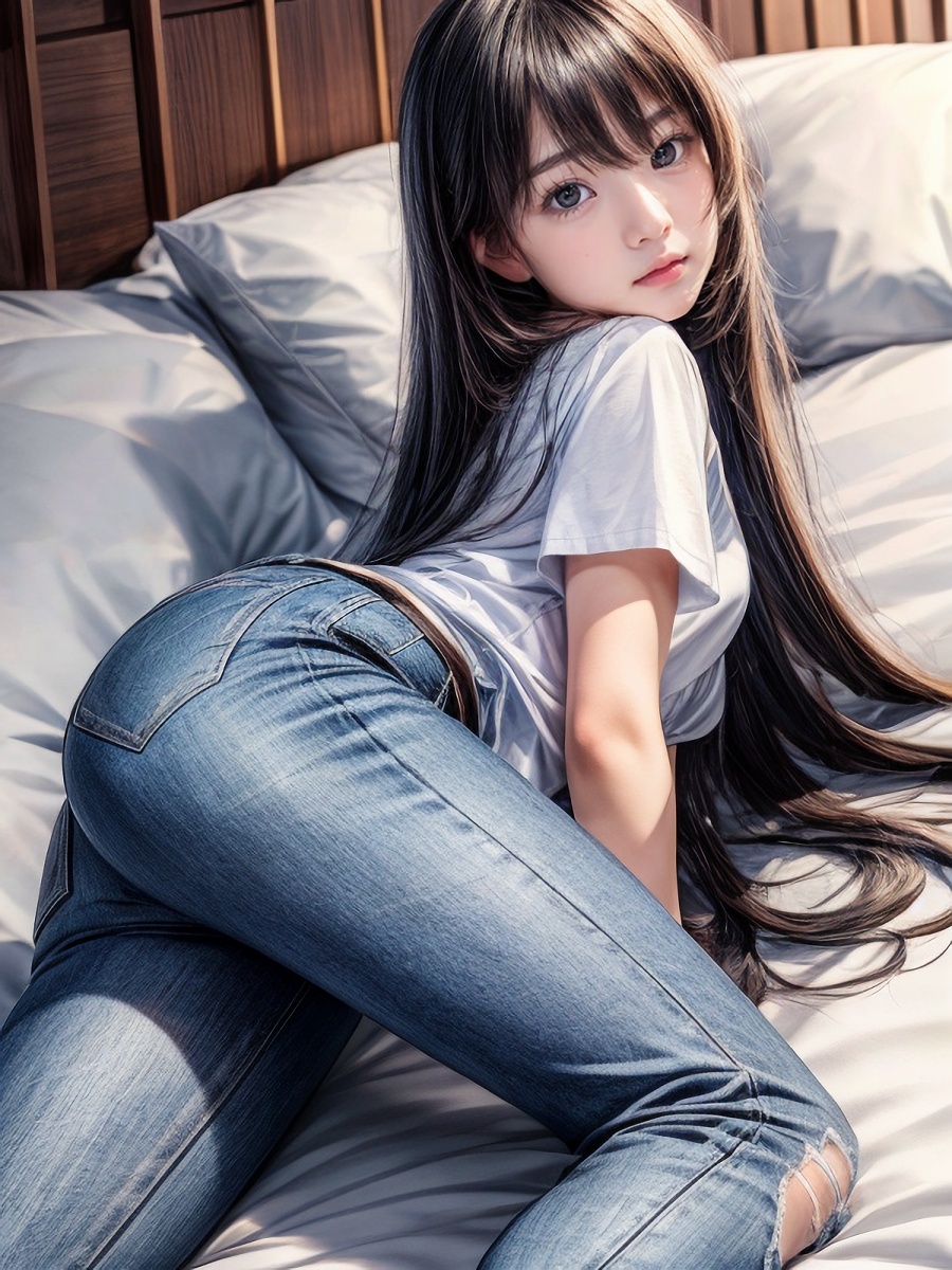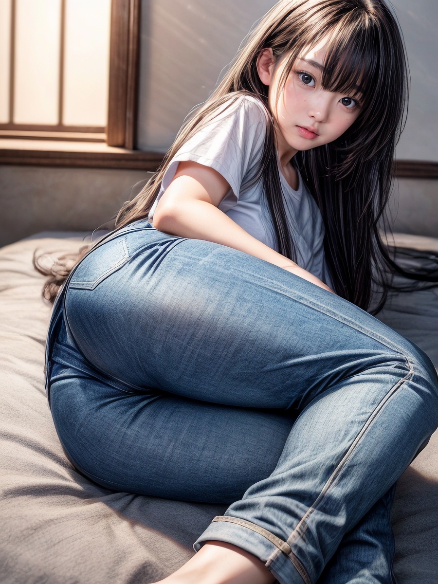 座り&横寝アングルのデニムジーンズのお尻がエロすぎる黒髪ロングヘアAI女子画像