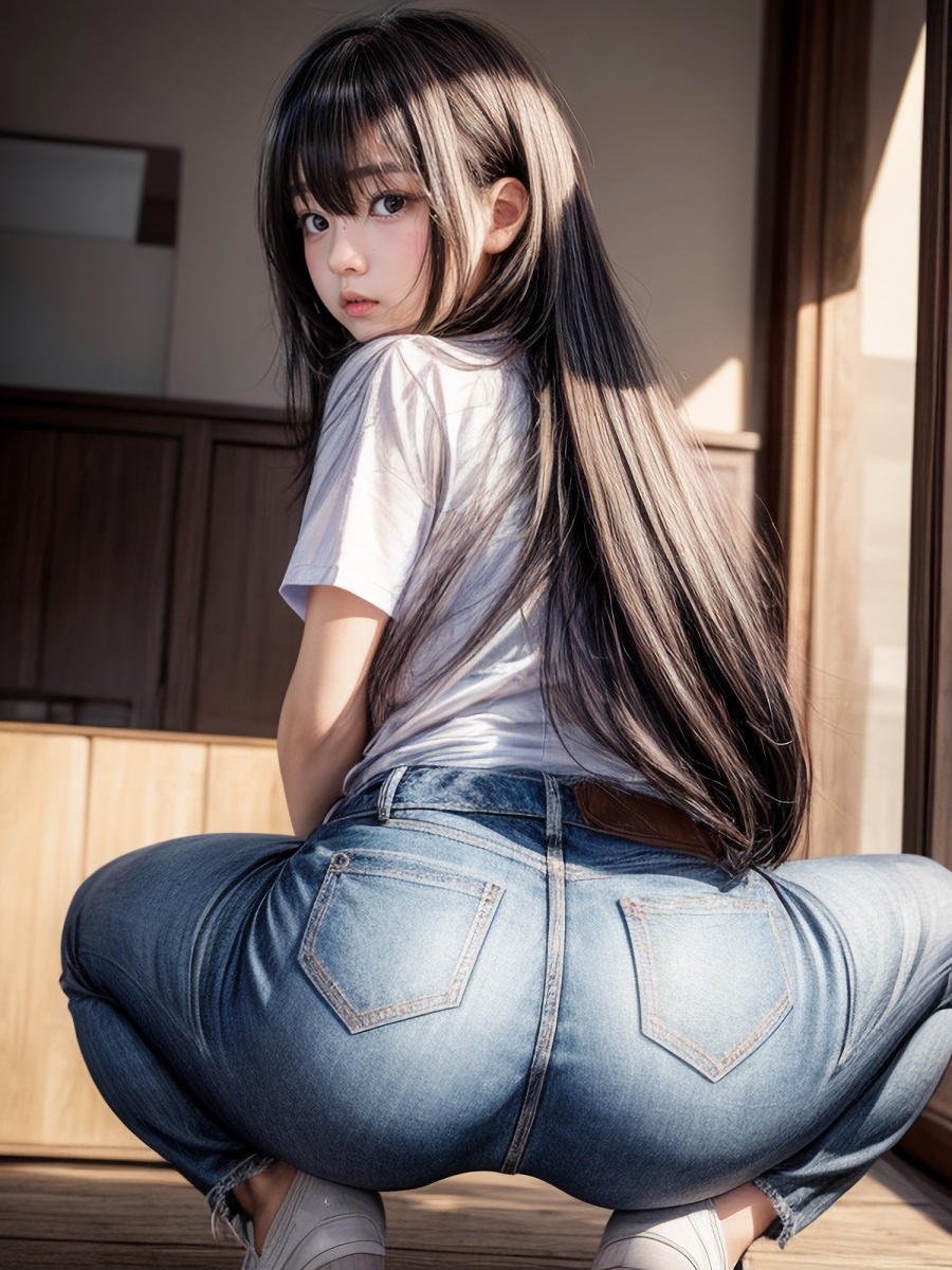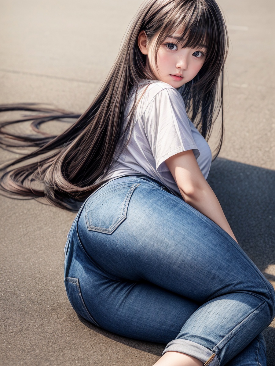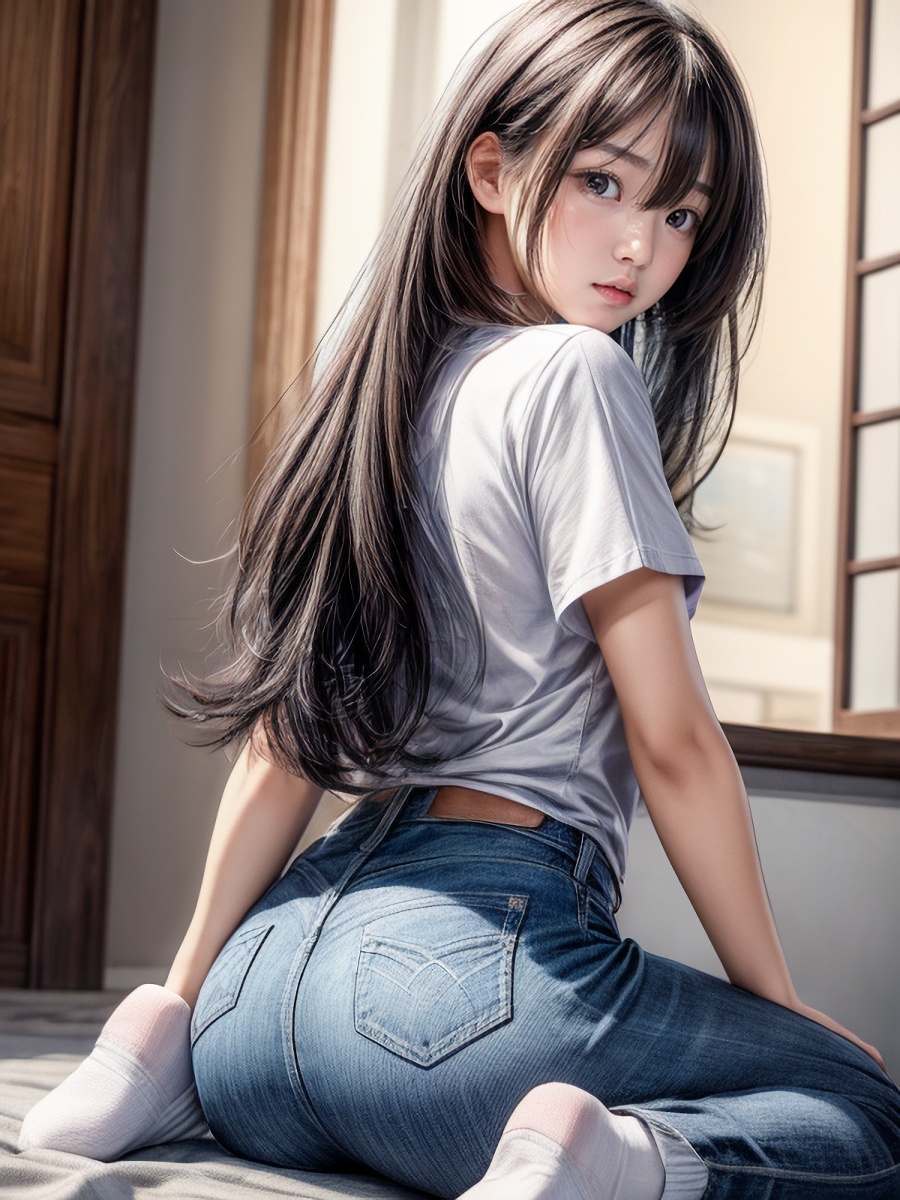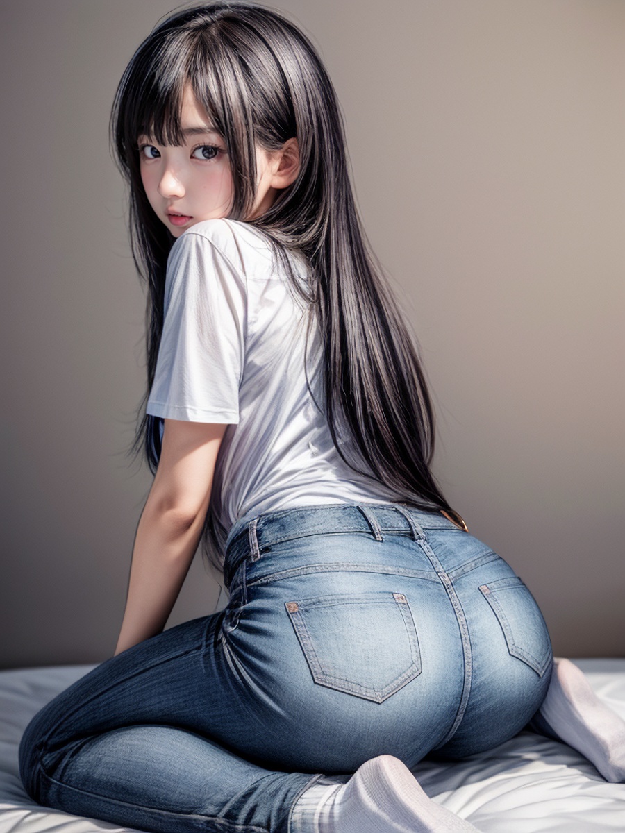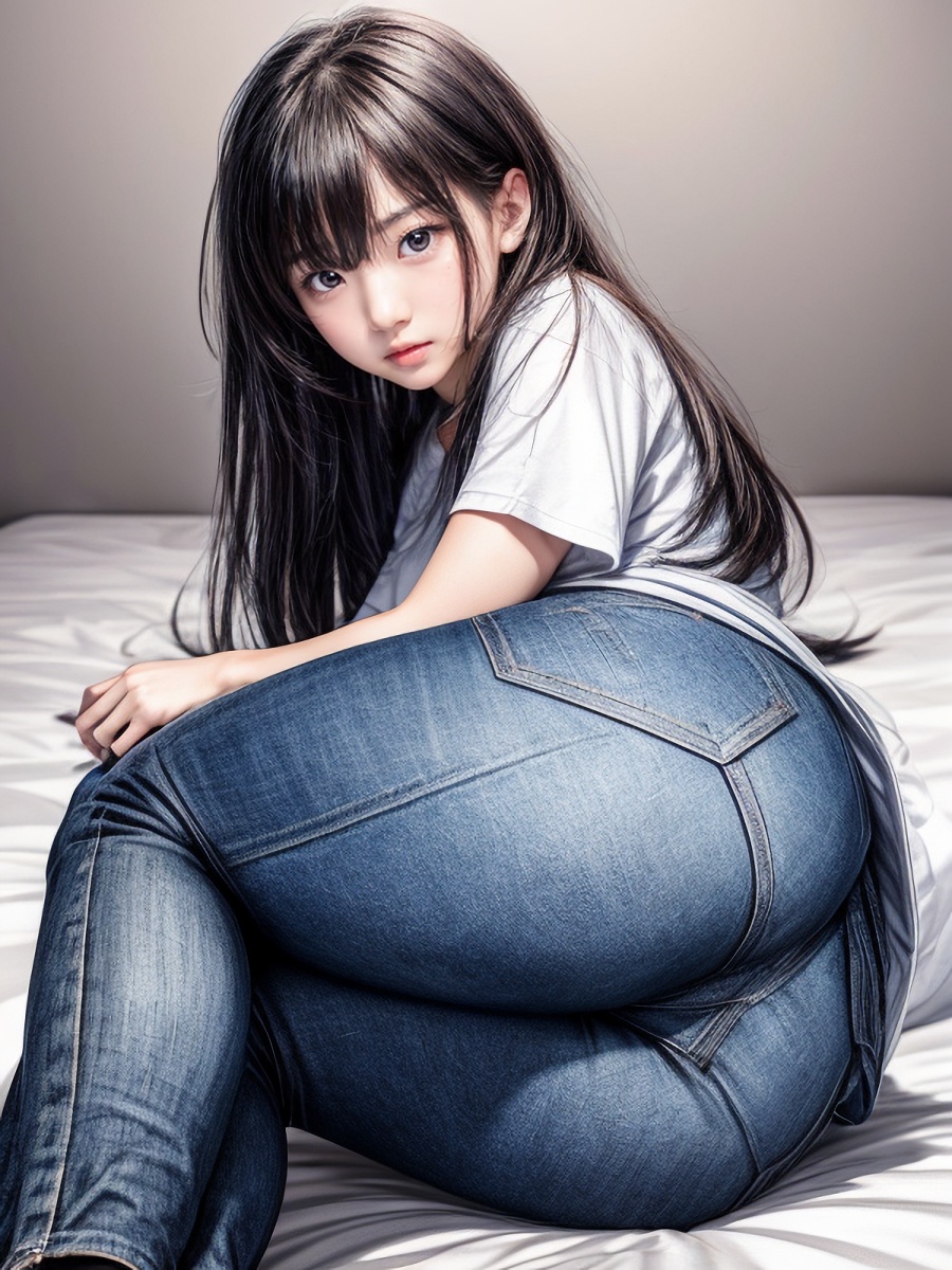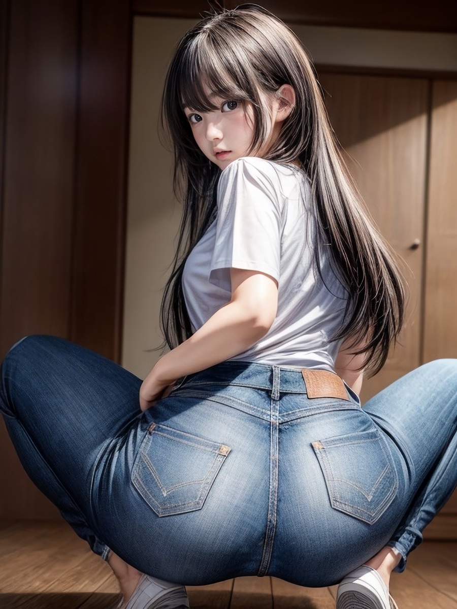 座り&横寝アングルのデニムジーンズのお尻がエロすぎる黒髪ロングヘアAI女子画像