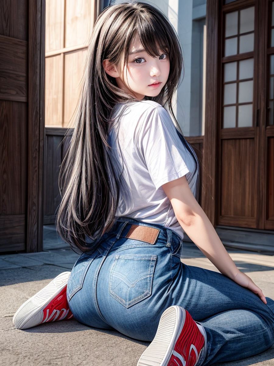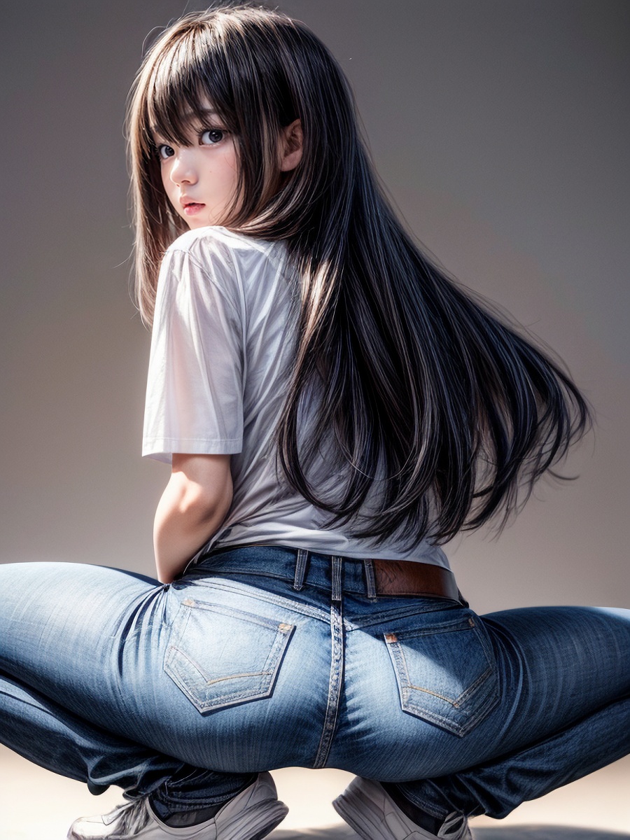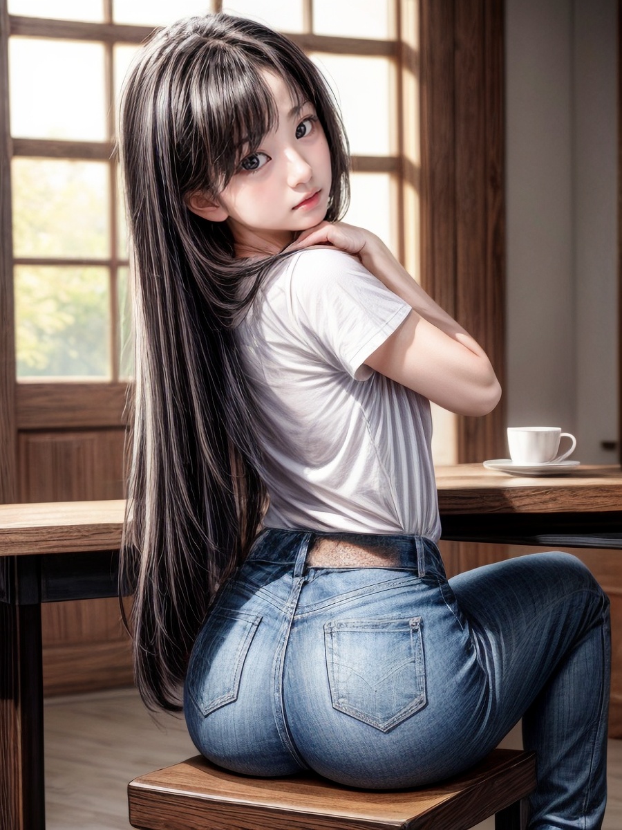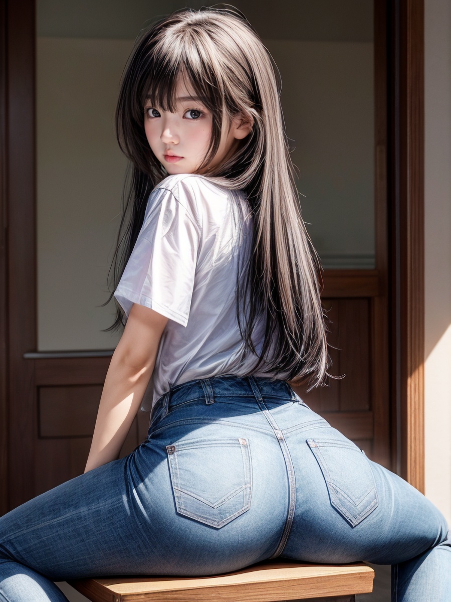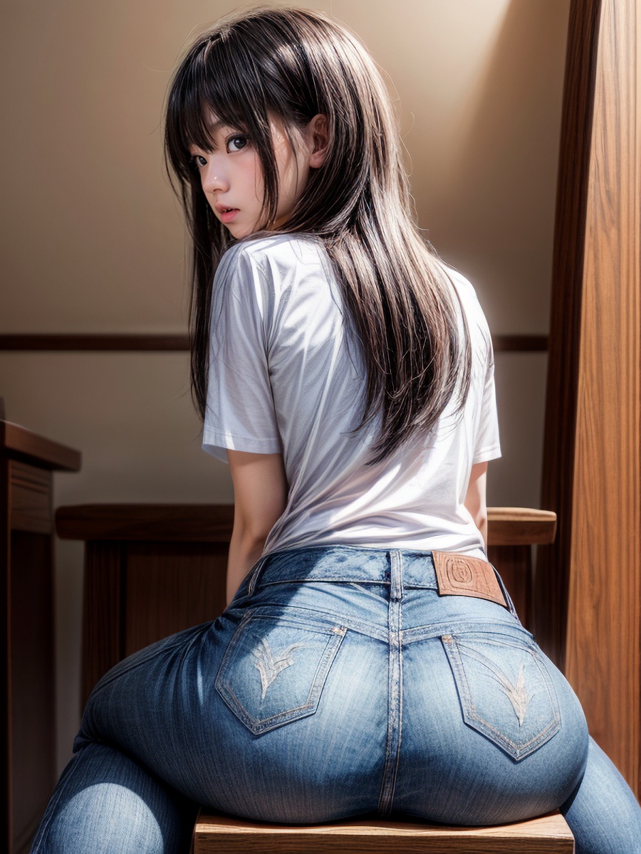 座り&横寝アングルのデニムジーンズのお尻がエロすぎる黒髪ロングヘアAI女子画像