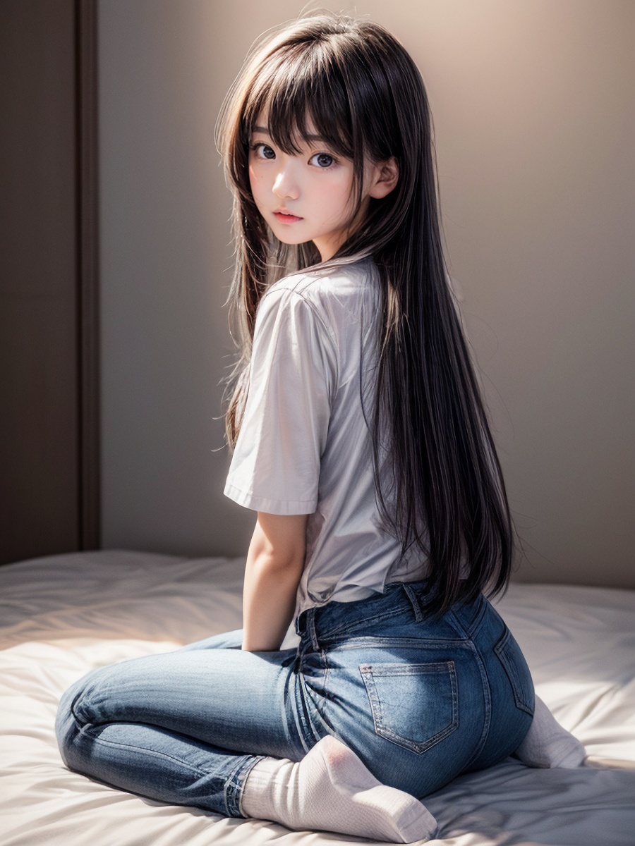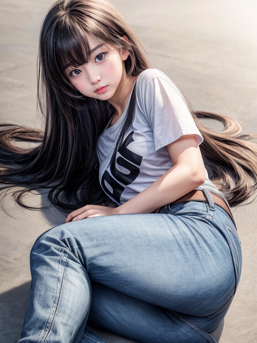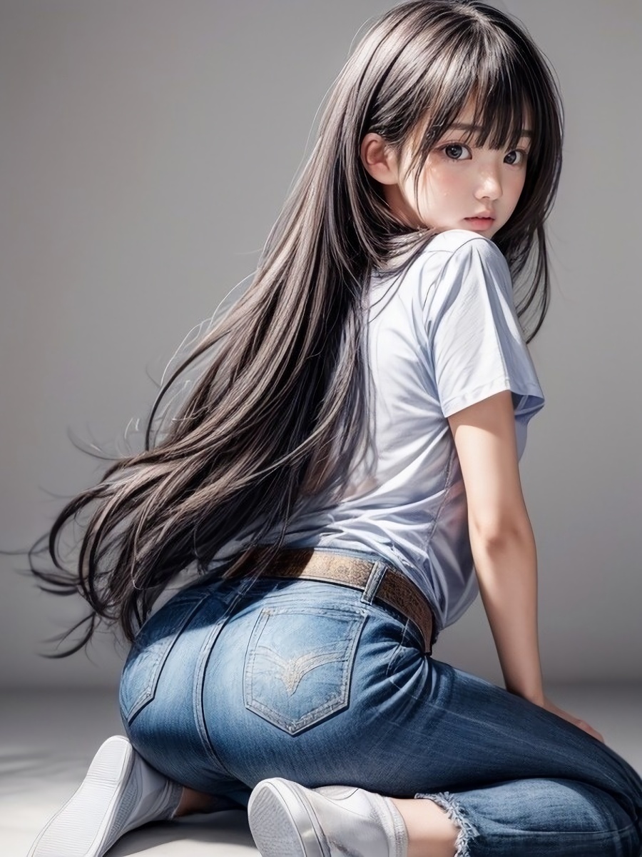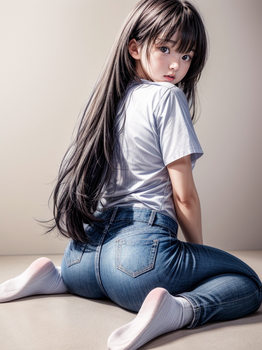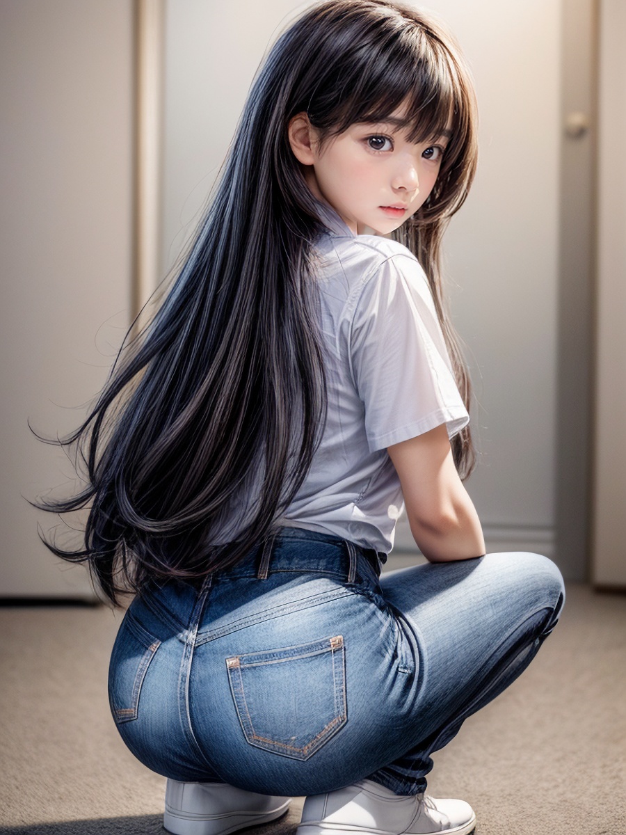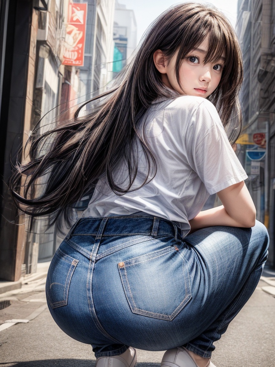 座り&横寝アングルのデニムジーンズのお尻がエロすぎる黒髪ロングヘアAI女子画像